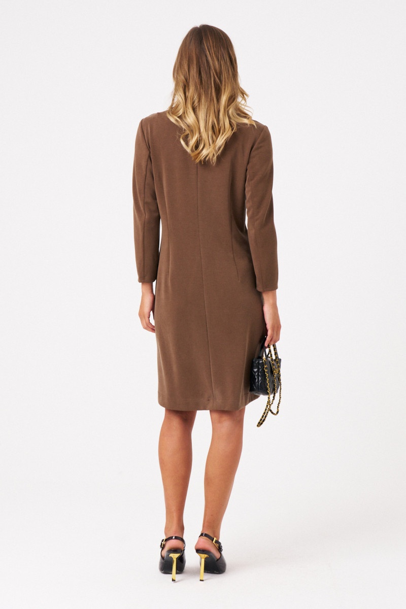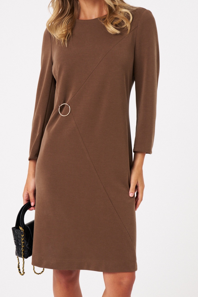 Это женское платье из мягкого трикотажного полотна с высоким содержанием вискозы, что обеспечивает приятную текстуру и комфорт при носке. Модель предназначена для повседневного использования и отлично подходит для сочетания с различными аксессуарами и обувью за счет своего коричневого оттенка. Перед украшен двумя криволинейными подрезами с вставками тесьмы, которая фиксирует декоративное золотистое кольцо по линии талии, добавляя образу изящества и акцента. Спинка платья выполнена с средним швом и потайной молнией, обеспечивая легкое и аккуратное надевание. Расширенная горловина делает посадку более комфортной и стильной, а длинные втачные рукава подчеркивают элегантность модели. Длина платья чуть выше колена делает его универсальным вариантом для различных повседневных ситуаций, удобным как для работы, так и для отдыха. Это просторное и стильное платье станет отличным дополнением гардероба, даря ощущение легкости и свободы движений.