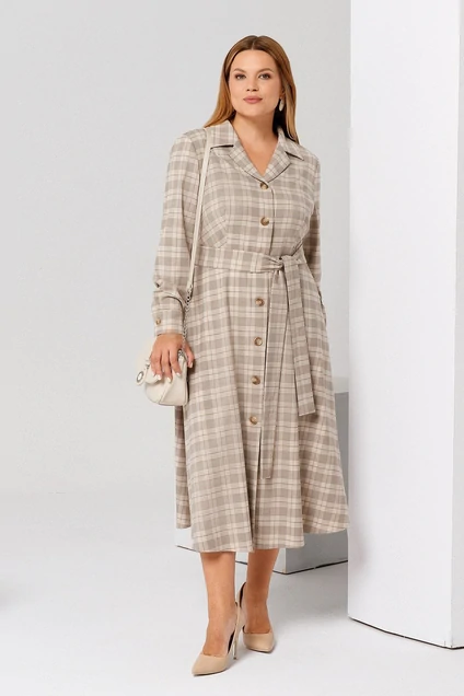 Стильное платье-рубашка из плательной вискозной ткани с рисунком в клетку. Платье длиной миди, с центральной сквозной застежкой на потайные петли и пуговицы, со съёмным поясом. Рукава длинные на притачной манжете. По бокам карманы. Отличный модный вариант платья для осенних дней. Платье женское на пуговицах и отложным воротником – кокетливая модель, которая хорошо подойдет для повседневной носки и посещения различных мероприятий. Трикотажное женское платье выполнено с добавлением вискозы, полиэтера и эластана. Благодаря чему оно хорошо подходит для межсезонья. Изделие длиной миди делает акцент на щиколотках. Подчеркнуть линии талии помогает пояс из той же ткани. Женское платье с длинным рукавом можно носить в дуэте с верхней одеждой и осенне-зимней обувью. Благодаря нейтральной расцветке, платье женское офисное подойдет для деловых встреч, бизнес-ланчей, семинаров, тренингов. Вы можете заказать женское платье больших размеров – от 46 до 54.
