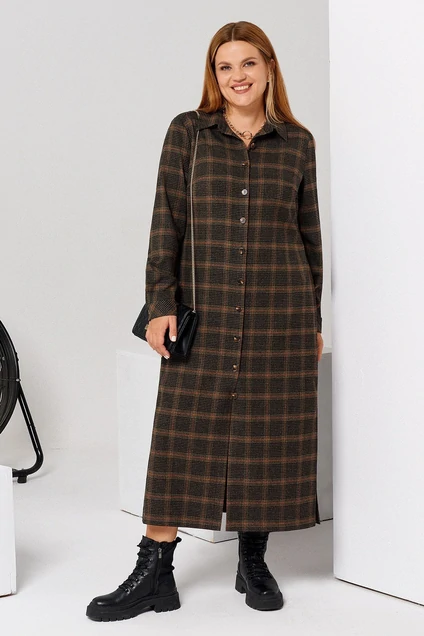 Подготовьтесь к осени и зиме, закажите теплое трикотажное платье в стиле кэжуал. Прямое платье с рукавом и отложным воротником дополнено рядом пуговиц, благодаря чему становится похожим на рубашку. Плотный трикотаж отлично защитит вас от холодов. Платье рубашку можно носить под куртку, шубку, сочетать с любой обувью, в том числе, массивными ботинками. Длинное платье имеет спокойную расцветку и приятный принт в клетку. За счет этого изделие визуально стройнит фигуру и придает образу модную небрежность. Вы можете заказать повседневное платье в стандартной линейке размеров 44-52.