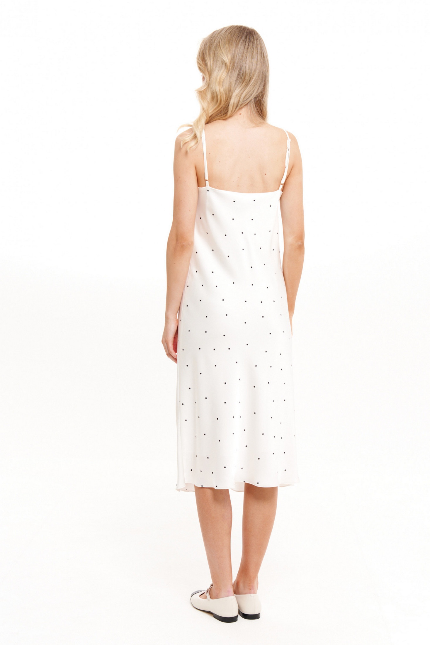 Платье 16580 молочный Panda из коллекции бренда Panda. Изготовлено из струящегося полиэстера, придающего изделию атласный блеск и легкость в носке. Свободный крой и прямой силуэт с V-образной горловиной подчеркивают женственность и элегантность, а регулируемые бретели обеспечивают комфортную посадку. С длиной миди платье идеально для офиса, вечерних мероприятий и прогулок теплым весенним днем. Легкий принт в виде мелких точек добавляет изящность, а молочный цвет позволяет легко сочетать модель с другими элементами гардероба. Вискозная подкладка гарантирует дополнительный комфорт и приятные тактильные ощущения.