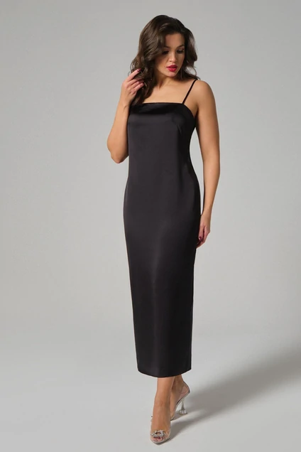 Платье женское прилегающего силуэта на бретелях. Брители регулируются. Длина платья до середины голени. Средний шов спинки заканчивается шлицей. Застегивается на потайную молнию в среднем шве спинки.