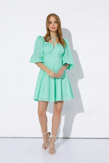 Платье длины мини из хлопкового ришелье. Детали: полуприлегающий силуэт, отрезная линия талии, вырез переда и спинки фигурной формы, спинка со средним швом и потайной застежкой-молнией, укороченные рукава, платье на подкладке