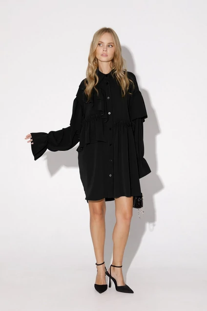 Свободное платье-рубашка из струящейся текстильной ткани с воланами. Детали: платье прямого силуэта, спущенная линия плеча, рубашечный воротник, застежка на петли и пуговицы, длинные рукава с резинкой.