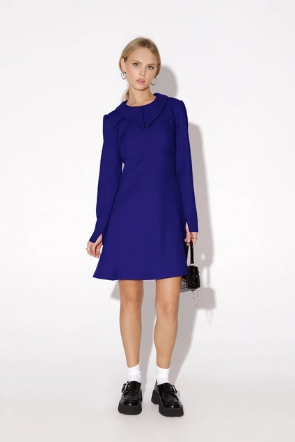 Мини-платье с акцентным воротником из текстильной ткани с рисунком «гусиная лапка». Детали: нагрудные вытачки, рельефные швы, длинные рукава со сборкой по окату и небольшим разрезом по низу. Застежка на потайную молнию в среднем шве спинки. Воротник съемный с застежкой на петли и пуговицы.