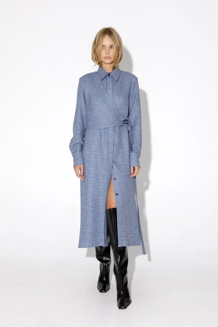 Асимметричное платье-рубашка из текстильной ткани с рисунком «гусиная лапка». Детали: трапециевидный силуэт, нагрудные вытачки, рубашечный воротник, потайная застежка-планка на петли и пуговицы, рукава втачные длинные на манжетах, боковые карманы. Платье с отлетной кокеткой, имитирующую жилет и поясами, при помощи которых можно регулировать прилегание.