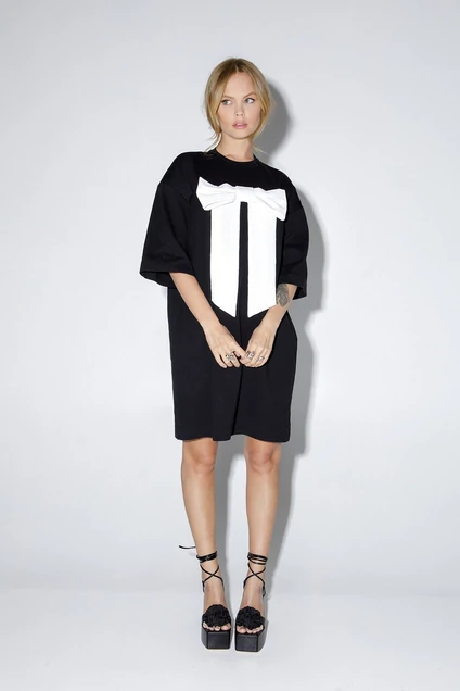 Платье-футболка из плотного хлопкового трикотажа с декоративным бантом. Детали: прямой силуэт, круглая горловина переда и спинки, кокетка переда, рукава короткие, платье без застежки.