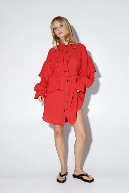 Свободное платье-рубашка с воланами. Детали: платье прямого силуэта, спущенная линия плеча, рубашечный воротник, застежка на петли и пуговицы, длинные рукава с резинкой. Длина по спинке около 90 см в размерах 40-46 и около 94 см в размерах 48-52, длина рукава+ плечо около 55+8=63 см.