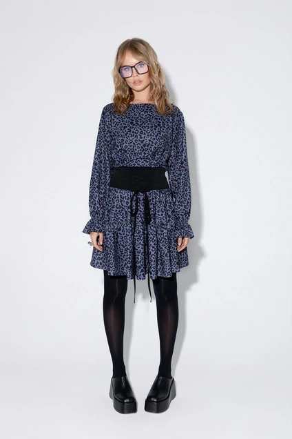 Детали: отрезная линия талии, пояс-кокетка с регулируемой шнуровкой, рукава втачные длинные, без застежки, платье на подкладке
