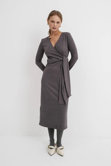 Платье полуприлегающего силуэта на запах из замшевой ткани.