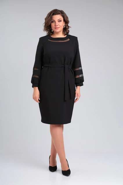 Платье женское относится к нарядной торжественной одежде. Платье полуприлегающего силуэта. Горловина и рукава в изделии со вставками из сетки. Застежка на потайную тесьму-молнию в среднем шве спинки. Рукав 7/8. Длина спинки 103см. Длина рукава 50см