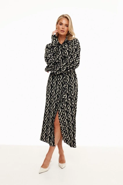 Платье – Рубашка прямого силуэта, большого обьема, миди. Плечо спущено. Перед с застежкой на 1 петлю и пуговицу на стойке и с супатной застежкой с цельнокроеными планками. Воротник рубашечного типа с отрезной стойкой, концы воротника закругленной формы. Рукава длинные с притачными фигурными манжетами.