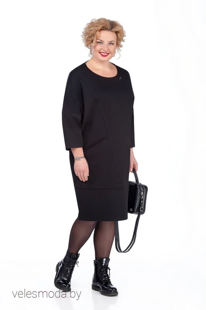 Платье-туника из трикотажа. Свободный крой «оверсайз», спущенная линия проймы. Перед и спинки асимметрично разделены косым рельефом от плеча до низа. Спереди обработан накладной карман, а на спинке декоративные подрезы. Длина по спинке 102см, длина рукавов около 46см.