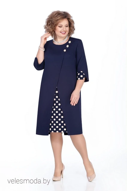 Платье из стрейчевой ткани с ассиметрично оформленными деталями переда. Перед с нагрудными вытачками, вставкой из отделочной ткани . Декором служат три крупные пуговицы. Спинка со средним швом и шлицей. Длина спинки 108 см. Длина одношовного рукава 44 см. Низ рукава с фигурной манжетой.