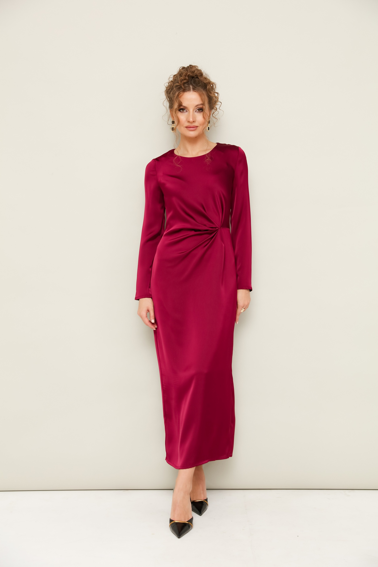 Вечернее платье полуприлегающего силуэта, выполнено из струящейся ткани с благородным матовым блеском. Горловина округлой формы. В области талии заложены складки, плавно переходящие в драпировку. Рукава втачные длинные. Застежка в среднем шве спинки на тесьму молнию. Для удобства движения сзади обработан разрез