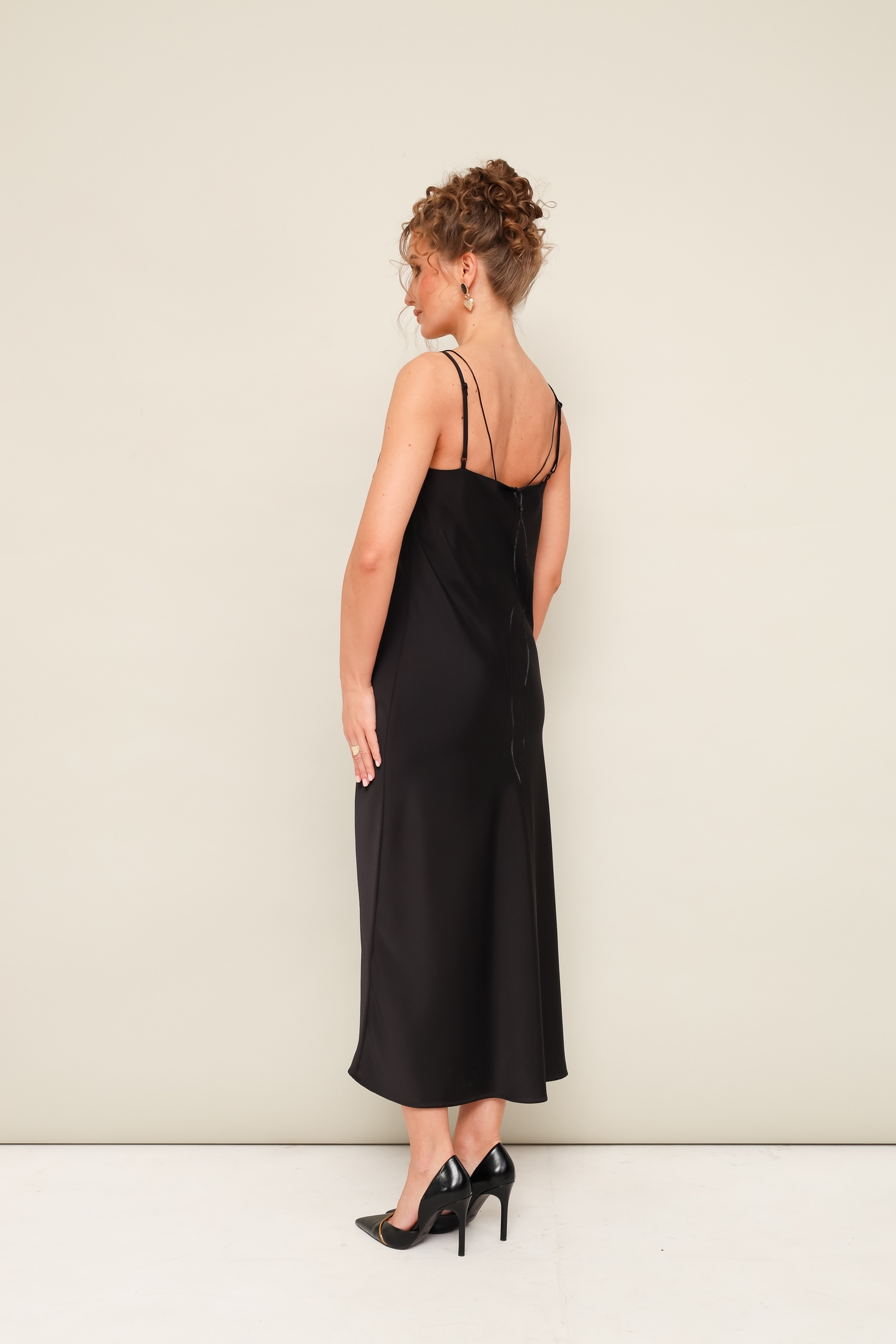 Платье-комбинация полуприлегающего силуэта, выполнено из струящейся ткани с матовым блеском. Крой по косой деликатно подчеркивает фигуру и скрывает недостатки. Основные бретельки регулируются по длине, декоративный шнур фиксируется на петлю по спинке. Платье без подкладки.