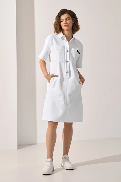 Платье джинсовое свободного силуэта с центральной застежкой на петли-пуговицы. Воротник рубашечного типа, по переду на груди накладные карманы с декоративной нашивкой. В области бедер прорезные функциональные карманы с листочкой. В боковых швах разрезы. Рукав короткий с манжетам.