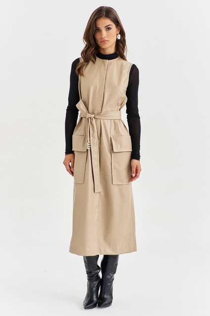 Платье полуприлегающего силуэта, длиной до середины икры. Платье отрезное по линии талии. Лиф платья по спинке и переду с рельефами. Юбка платья с горизонтальным подрезом, с рельефами от талии до подреза. По боковым, в области бедер настрочены накладные карманы и клапаны. Платье без рукавов и воротника. Застежка на кнопки. Платье дополняет съемный пояс.