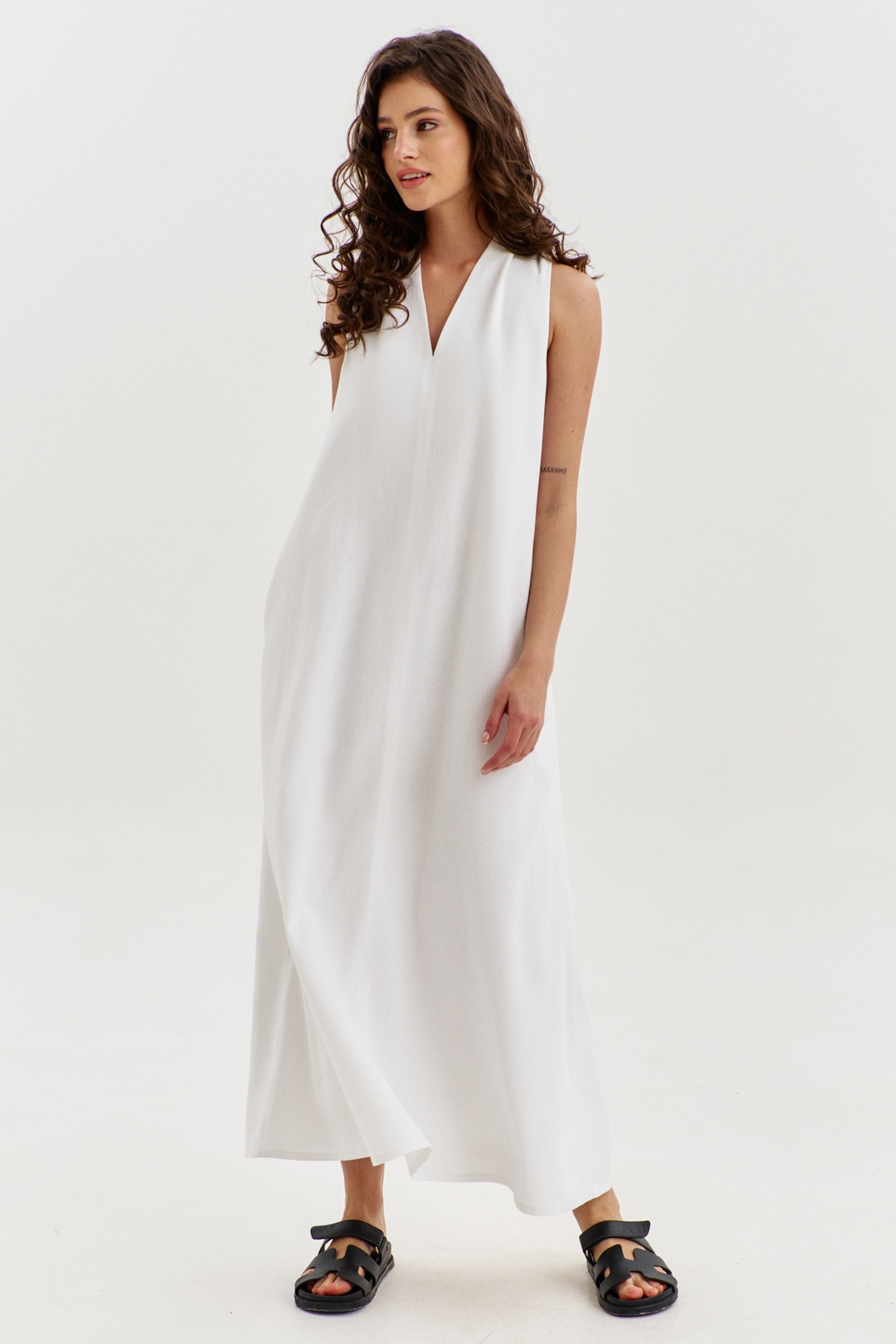 Платье свободного кроя, расширенное к низу, длиной выше щиколотки. Платье по спинке со средним швом, в котором, выше талии обработан разрез на запах. Перед со средним швом, с мягкими складками от плеча. Платье с английской проймой. Горловина V-образной формы. В боковых швах обработаны карманы. Платье на подкладке.