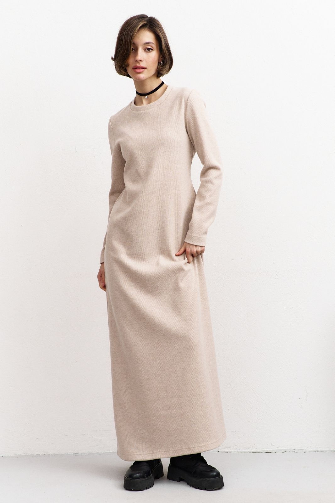 Элегантное макси-платье А-силуэта в нежно-бежевом оттенке представляет собой идеальное сочетание классики и современного стиля. Модель с длинными рукавами и округлой горловиной подчеркивает изящество и женственность. Платье выполнено из качественного трикотажа, обеспечивающего комфорт и удобство при носке. Дизайн без лишних деталей подчеркивает элегантность и универсальность наряда, делая его идеальным выбором для повседневной носки или особых случаев.