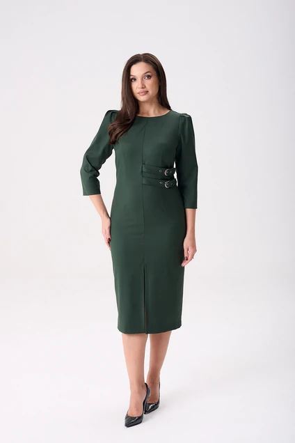 Платье женское прямого силуэта выполнено из плательной ткани. Платье с округлой горловиной. По переду платья расположены талиевые выточки и средний шов, переходящий к низу в разрез, придающий нотку игривости и удобства. Сбоку по переду платья имеется два декоративных хлястика с пряжками. Спинка прямая разрезная на потайную застежку-молнию и талиевыми выточками. Рукав прямой втачной, длиной 7/8, одношовный, со складками по окату.