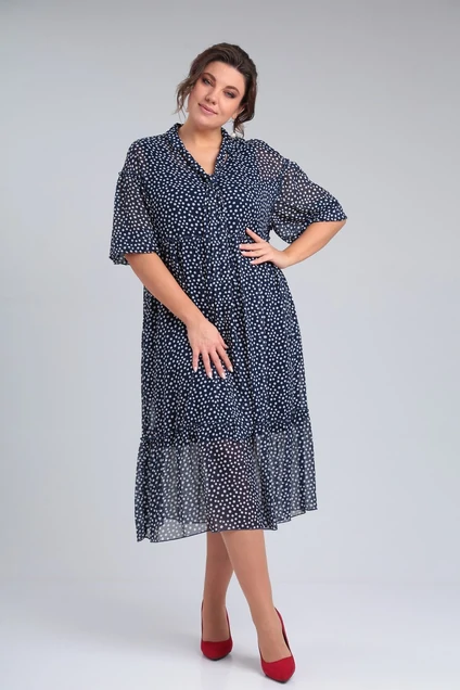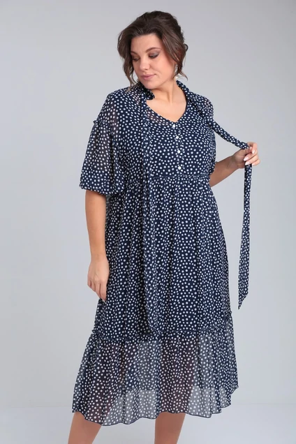 Платье женское 2-х предметное состоящие из шифона свободного кроя и платья-комбинации. Лиф переда с центральной застежкой на петли пуговицы. Вырез горловины V-образный с отложным воротником. Линия плеча приспущена с притачным рукавом на подкладке. К лифу притачены два объемных волана. Платье дополняет съемный пояс, который можно использовать в качестве галстука и банта. Длина изделия: 119 см.