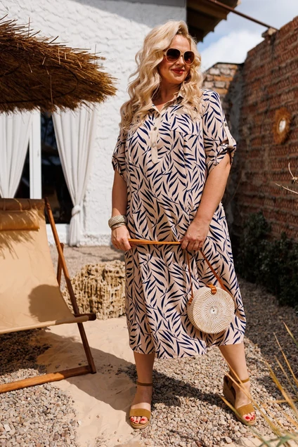 Платье женское предназначено для повседневной носки. Платье женское прямого силуэта, длиной до середины икры. Перед с двумя рельефами, выходящими из плечевых швов, проходящими через центр груди, на уровне линии бедер переходящие в односторонние складки. Перед с одним нагрудным фигурным карманом, с обтачкой из отделочной ткани, с двумя вертикальными планками из отделочной ткани. Спинка со средним швом. В боковых швах обработаны карманы. Боковые швы с закругленными обтачными разрезами. Горловина круглая, с втачным воротником рубашечного типа, с отрезной стойкой из отделочной ткани. Рукав втачной, одношовный, длиной до локтя с патой из отделочной ткани, фиксирующей длину рукава на одну пробивную металлическую кнопку. Застежка центральная на пять пробивных металлических кнопок. Платье с плечевыми накладками. Длина рукава 34 см. Длина спинки 114 см