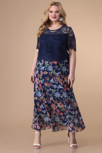 Платье женское полуприлегающего силуэта, отрезное по линии талии, с отлетным лифом. Верхняя часть переда с двумя нагрудными вытачками и отрезной кокеткой. Верхняя часть спинки с отрезной кокеткой. Нижняя часть платья юбка-шестиклинка. Горловина круглая, обтачная, без воротника. Рукав до локтя, одно шовный, втачной. Платье на подкладке. К платью прилагается съемное украшение. Длина спинки 132 см. Длина рукава 31.5 см