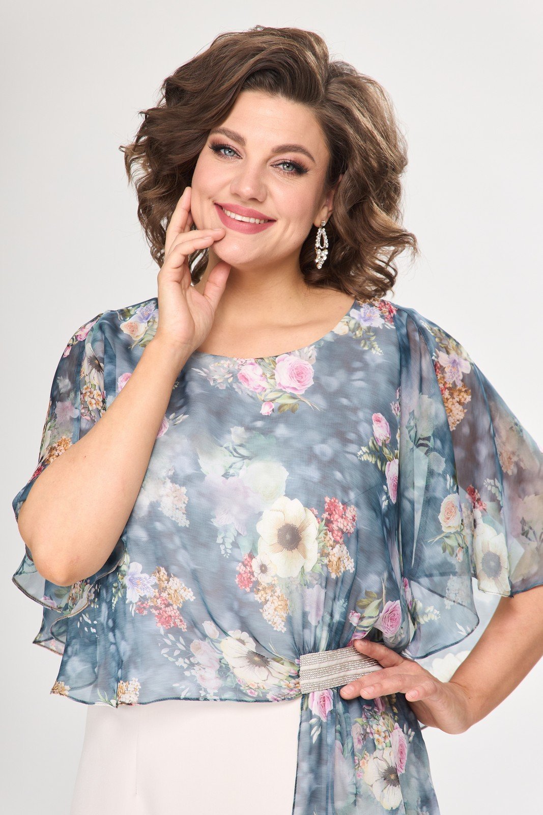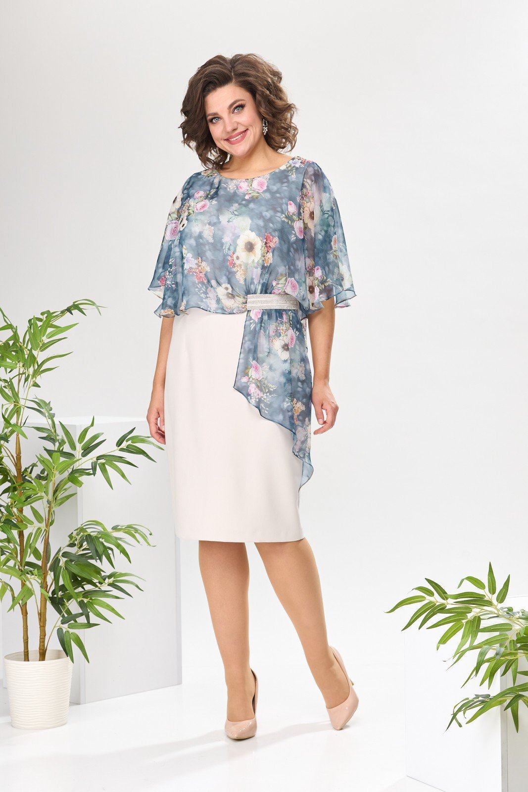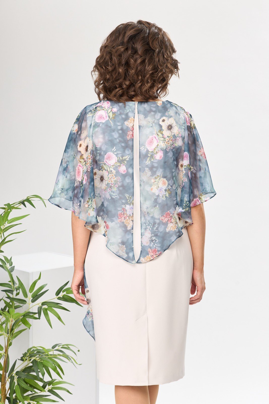 Платье женское относится к нарядной торжественной одежде. Платье полуприлегающего силуэта, с отлетной накидкой длиной за колено. Перед с двумя нагрудными вытачками, с двумя талиевыми вытачками. Спинка с двумя талиевыми вытачками и средним швом, заканчивающимся шлицей. Застежка на потайную тесьму-молнию в среднем шве спинки. Горловина круглая, обтачная, без воротника, по горловине закреплена накидка. Слева на уровне линии талии отделочным хлястиком, декорированным тесьмой накидка закрепляется на платье, нижняя часть накидки закреплена в левом боковом шве. Накидка с фигурным низом. Платье без рукавов. Длина спинки 103см. Длина накидки от горловины 38см