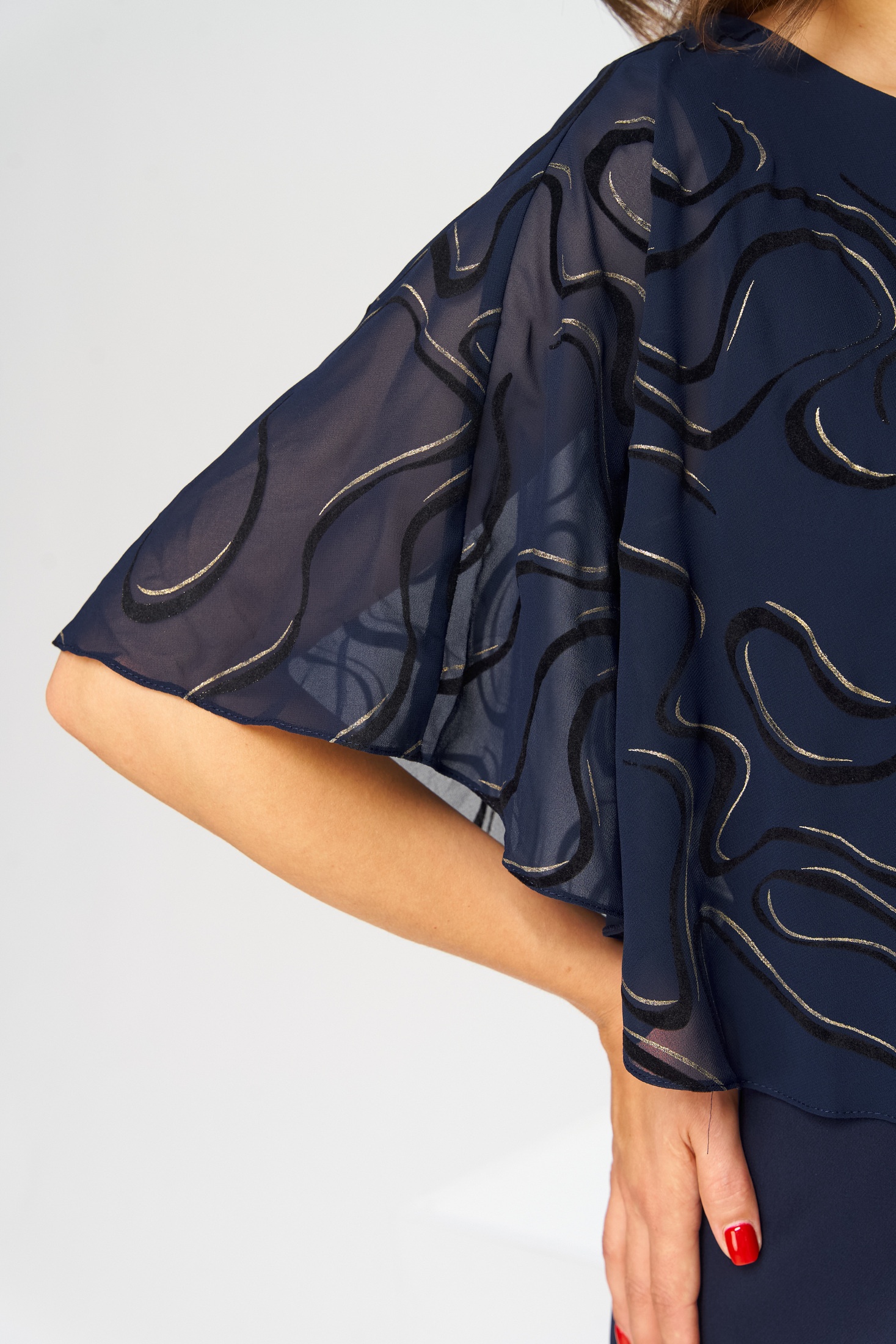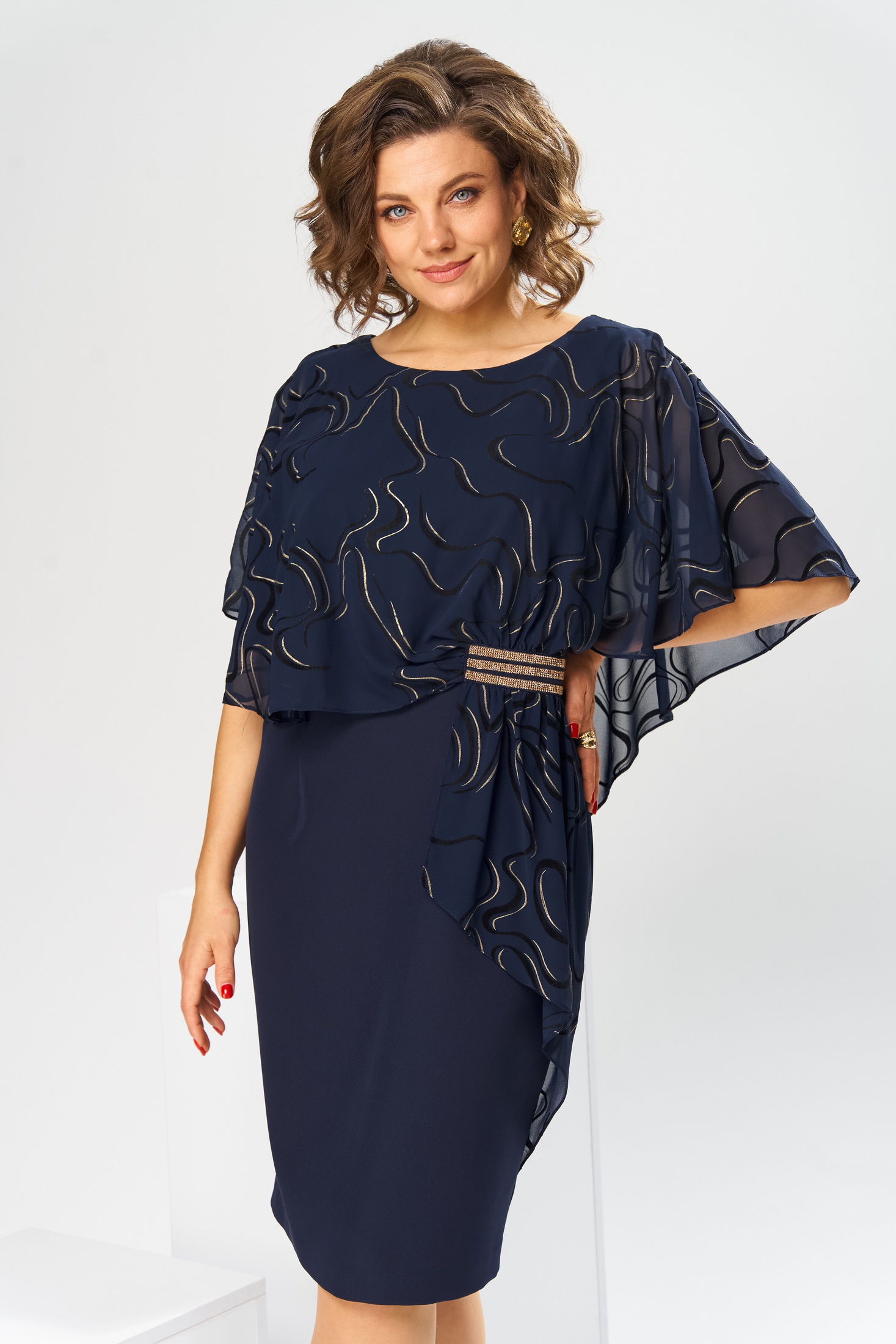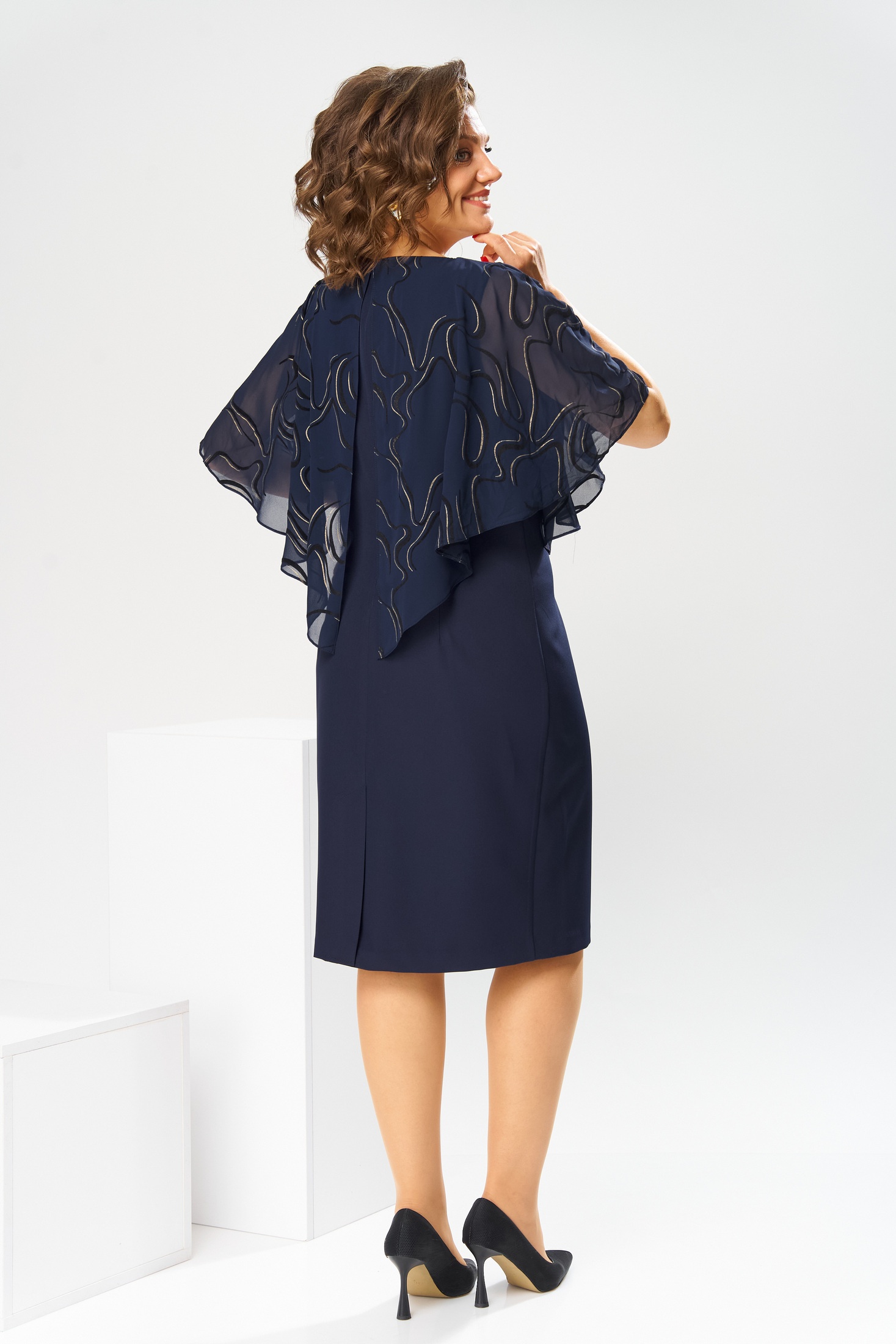 Платье женское относится к нарядной торжественной одежде. Платье полуприлегающего силуэта, с отлетной накидкой длиной за колено. Перед с двумя нагрудными вытачками, с двумя талиевыми вытачками. Спинка с двумя талиевыми вытачками и средним швом, заканчивающимся шлицей. Застежка на потайную тесьму-молнию в среднем шве спинки. Горловина круглая, обтачная, без воротника, по горловине закреплена накидка. Слева на уровне линии талии отделочным хлястиком, декорированным тесьмой накидка закрепляется на платье, нижняя часть накидки закреплена в левом боковом шве. Накидка с фигурным низом. Платье без рукавов. Длина спинки 103 см. Длина накидки от горловины 38 см