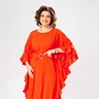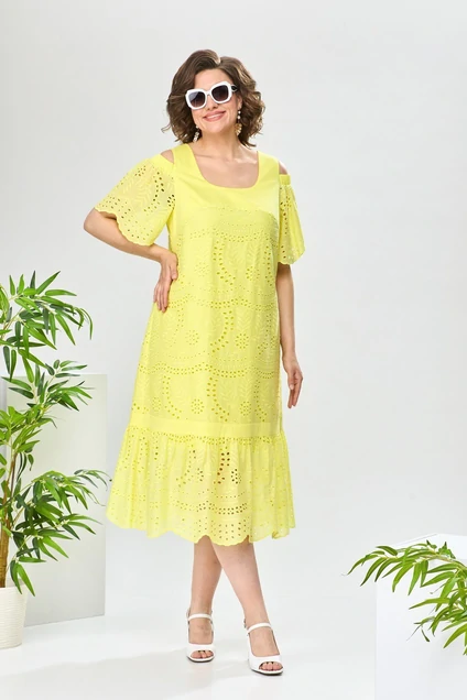 Платье женское предназначено для повседневной носки. Платье А-силуэта, длиной до середины икры. Перед с отрезной кокеткой из отделочной ткани, с 2-мя нагрудными вытачками. Спинка с отрезной кокеткой из отделочной ткани. Низ платья с приточной планкой из отделочной ткани м притачного волана с лёгкой сборкой по нижнему срезу. Горловина "о"образная обточная без воротника. Рукав втачной короткий, одно шовный с декорированным вырезом из отделочной ткани, собранной на эластичную тесьму. Платье на подкладке. Платье без плечевых накладок. Длина спинки 105 см, длина рукава 25 см.