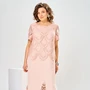 Платье женское, коктейльное. Платье женское отрезное по линии талии, расширенное к низу, длиной до середины икры. Верхняя часть переда с 2-мя отрезными бочками, нижняя часть переда двойная: верхняя с отрезным бочком и разрезом от линии талии, нижняя из отделочной ткани. Верхняя часть спинки с 2-мя таллиевыми вытачками и средним швом. Горловина фигурная "лодочка" обточная без воротника. Застёжка на потайную тесьму-молнию в среднем шве спинки. Рукав втачной, длинный, одно шовный из отделочной ткани. Окат рукава и низ рукава со сборкой. Низ рукава с притачной манжетой с застёжкой на 2-е обмётанные петли и 2-е пришивные пуговицы. На уровне талии по боковым швам закреплены шлёвки, в которых держится съёмный пояс. Платье на подкладке. Платье без плечевых накладок. Длина спинки 112 см, длина рукава 60 см.