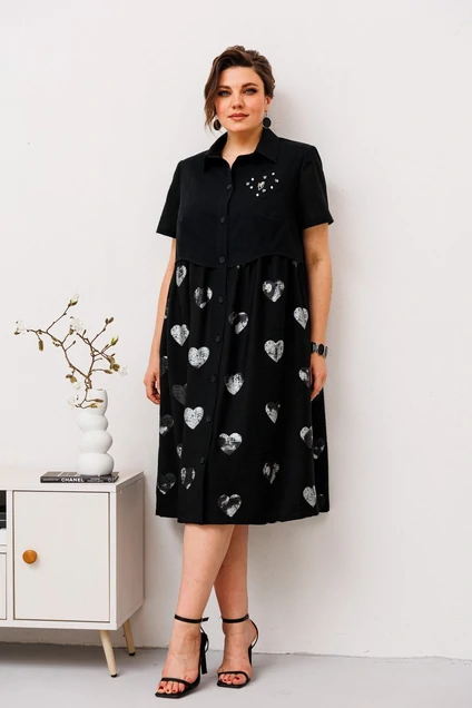Платье предназначено для повседневной носки. Платье женское, отрезное выше линии талии расширенное к низу длиной ниже колена на 10 см. Верхняя часть платья двойная с отлетной верхней частью. Перед с 2-мя нагрудными вытачками, с 2-мя притачными центральными вертикальными планками, нижняя часть переда со сборкой по верхнему срезу. Верхняя часть спинки 2-ная цельнокроеная, нижняя часть со сборкой по верхнему срезу. В боковых швах обработаны карманы. Горловина круглая с втачным воротником рубашечного типа с отрезной стойкой. Застёжка центральная на 10-ть вертикальных обмётанных петельна 10-ть пришивных пуговиц. Рукав втачной короткий одно шовный. Платье с плечевыми накладками. Перед платья декорируются надстрочной аппликацией на левой части отлётного переда. Длина спинки 112 см, длина рукава 22,5 см.