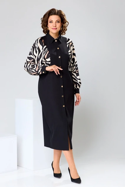 Платье женское прямого силуэта, предназначено для повседневной носки. Платье женское, прямого силуэта, длиной до середины икры. Перед с 2-мя отрезными бочками, с 2-мя вертикальными цельнокроеными планками. Спинка со средним швом, с 2-мя отрезными бочками, с 2-мя таллиевыми вытачками. Рукав длинный одно шовный, цельнокроеный с бочком переда и бочком спинки, рукав из отделочной ткани, внизу со сборкой и притачной манжетой с застёжкой на петлю обмётанную 1-ну и 1-ну пришивную пуговицу. Боковые швы с карманами. Горловина круглая с втачным воротником рубашечного типа с отрезной стойкой из отделочной ткани. Застёжка центральная на 8-мь вертикально обмётанных петель и 8-мь пришивных пуговиц. Платье без плечевых накладок. Длина спинки платья 121 см, длина рукава 65 см, дли на рукава о горловины 73 см.