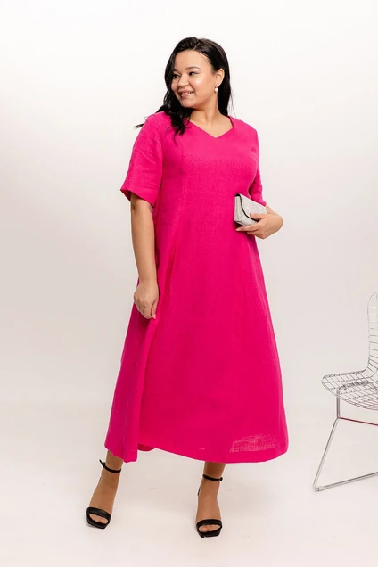 Платье полуприлегающего силуэта, расширенное к низу. Форма горловины переда - V-образная. Длина платья миди. Рукав втачной до уровня локтя. Перед и спинка с рыльефными швами. Платье изготовлено из ткани, в составе которой лен 100%.