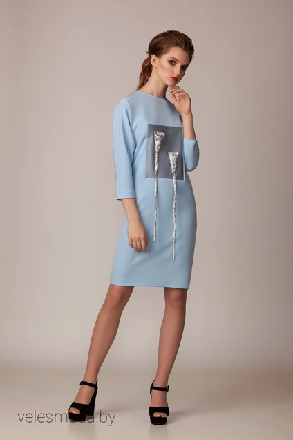 Платье силуэта «летучая мышь» из плательной стрейчевой ткани. Нежный голубой цвет в сочетании со вставкой из кожи оттенка серебра и цветами ручной работы, украшающими перед платья - все это выглядит роскошно и стильно. Молния в среднем шве спинки. Рукава трехчетвертные.Длина изделия по спинке от точки основания шеи до низа-100 см. рукав - 58 см. Цвет голубой.