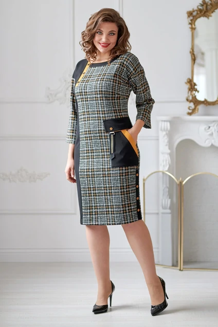 Платье женское, полуприлегающего силуэта из трикотажной ткани. Перед платья с нагрудными выточками. На боковой части расположен накладной карман с клапаном. Карман оформлен отделочной тканью. В левом боковом шве планка-застежка на петлях, пуговицах. Спинка платья со средним швом и шлицей. Рукав спущенный. Вырез горловины круглый и оформлен отделочной бейкой.