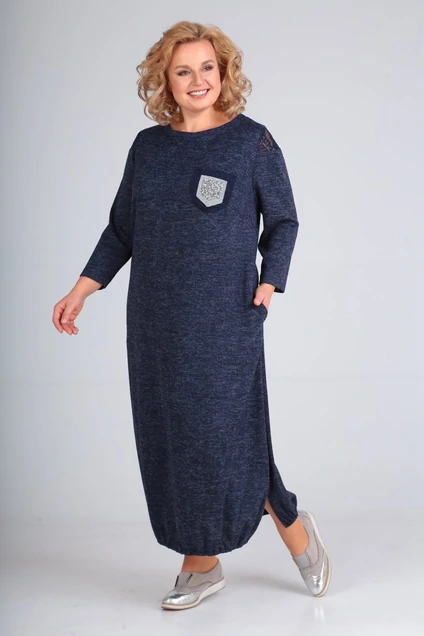 Силуэт полуприлегающий, расширенный книзу. Рукав втачной, одношовный. Вверху рукав с отрезным окатом из кружева. Длина рукава 50 см. Горловина платья закруглённой формы, оформлена отрезной бейкой. Перед с нагрудными вытачками и накладным карманом из кружева. Карман декорирован настрочной аппликацией со стразами. Спинка со средним швом. В боковых швах платья на уровне линии бёдер выполнены потайные карманы. Внизу боковых швов выполнены разрезы высотой 16 см. Низ платья присобран на резинку. Длина платья 126 см. Платье выполнено из трикотажного полотна