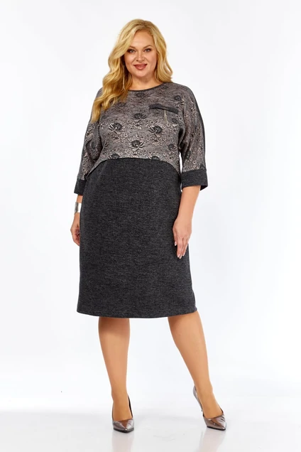 Силуэт полуприлегающий. Рукав цельнокроеный, «летучая мышь». Низ рукава на манжетах. Длина рукава от горловины 52см. Горловина платья закруглённой формы, оформлена отрезной бейкой. Перед состоит из двух частей, изготовленных их разного материала. Верхняя деталь переда выполнена из трикотажного полотна, стилизованного под гипюр. Соединение верхней и нижней частей переда имеет отлетной край. В верхней части переда, слева, расположен клапан, украшенный пришивными элементами. Спинка со средним швом. В боковых швах платья на уровне линии бёдер выполнены потайные карманы. Длина платья по спинке 104 см. 60 р. – ПОГ 63, ПОБ 65