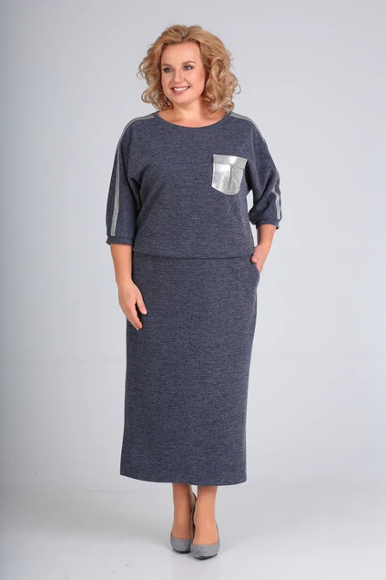Силуэт полуприлегающий. Рукав цельнокроеный, «летучая мышь», низ на манжетах. Длина рукава с манжетой от горловины 50 см. По линии плеча вставлена бейка из отделочной ткани. Горловина платья закруглённой формы, оформлена отрезной бейкой. Вверху слева настрочен накладной карман с отворотом из отделочной ткани. Платье немного ниже уровня талии отрезное. Верхняя часть платья с напуском. Внутри верхняя часть платья на подкладке, фиксирующей напуск. По бокам нижней части переда выполнены карманы с закруглённой линией входа. Внизу боковых швов выполнены разрезы. Спинка в верхней части со средним швом. Длина платья 124 см. Платье выполнено из трикотажного полотна с люрексом.