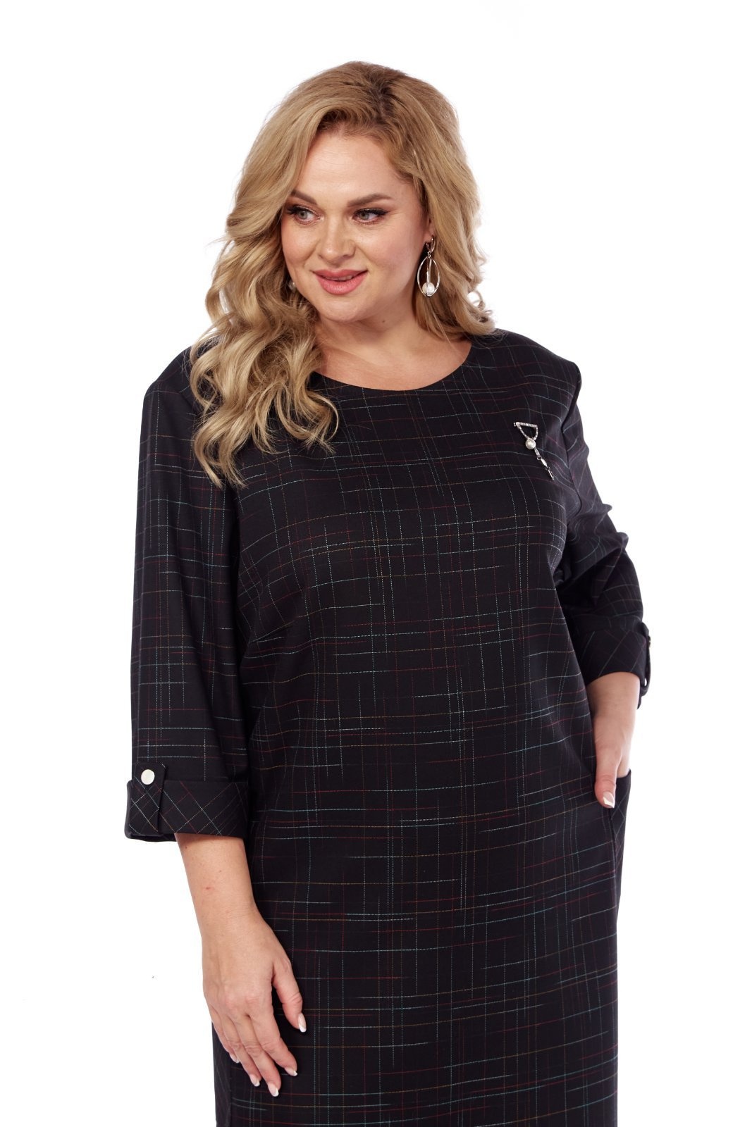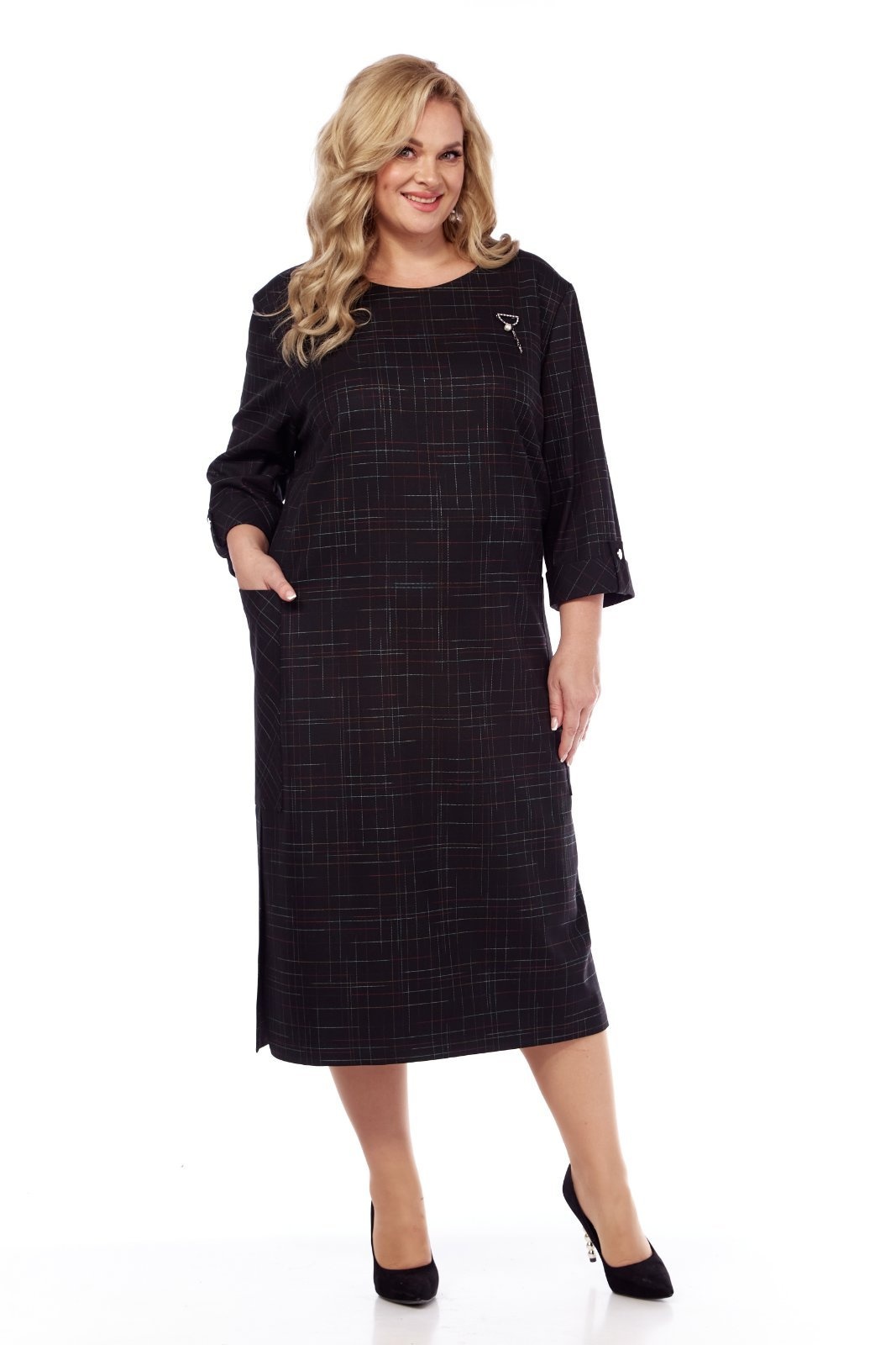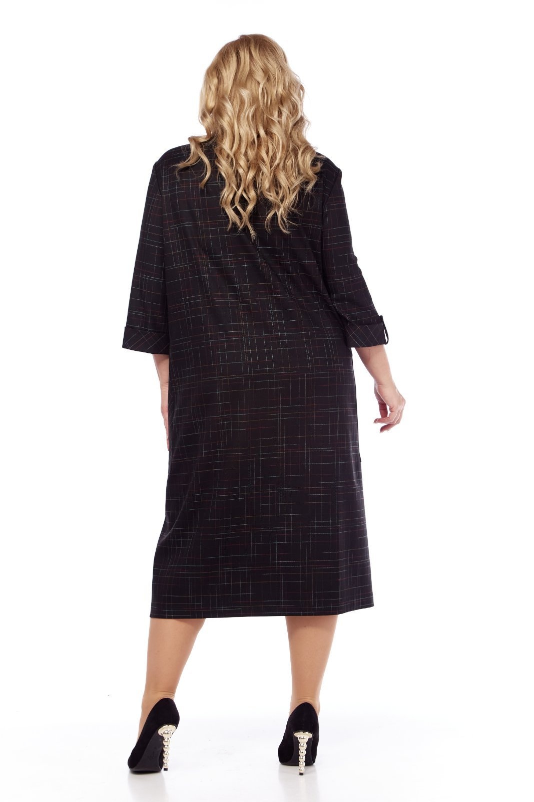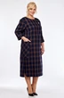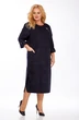 Силуэт полуприлегающий, расширенный к низу. Рукав втачной, одношовный. Внизу рукава выполнены отвороты, закреплённые патой с застёжкой на пуговицу. Длина рукава 45 см. Горловина закруглённая, на обтачке. Перед с нагрудными вытачками. На уровне бёдер по бокам расположены накладные карманы. Внизу боковых швов выполнены шлицы. Длина платья 118 см. Платье выполнено из ткани костюмно-плательной группы.