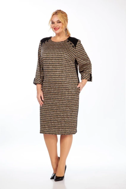 Силуэт полуприлегающий. Рукава втачные, одношовные, внизу с отворотами, закреплёнными патой контрастрого цвета с застёжкой на пуговицу. Длина рукава 47 см. Горловина закруглённая, на обтачке. Перед с нагрудными вытачками. Верх переда с кокетками контрастного цвета. Возле кокеток пришиты 3 декоративные пуговицы. По боковым швам платье отделано вставками контрастного цвета. Спереди, на уровне бёдер, в боковых швах выполнены потайные карманы. Длина платья по спинке 106 см. Платье выполнено из трикотажного полотна. 62 размер – ПОГ 65, ПОБ 68