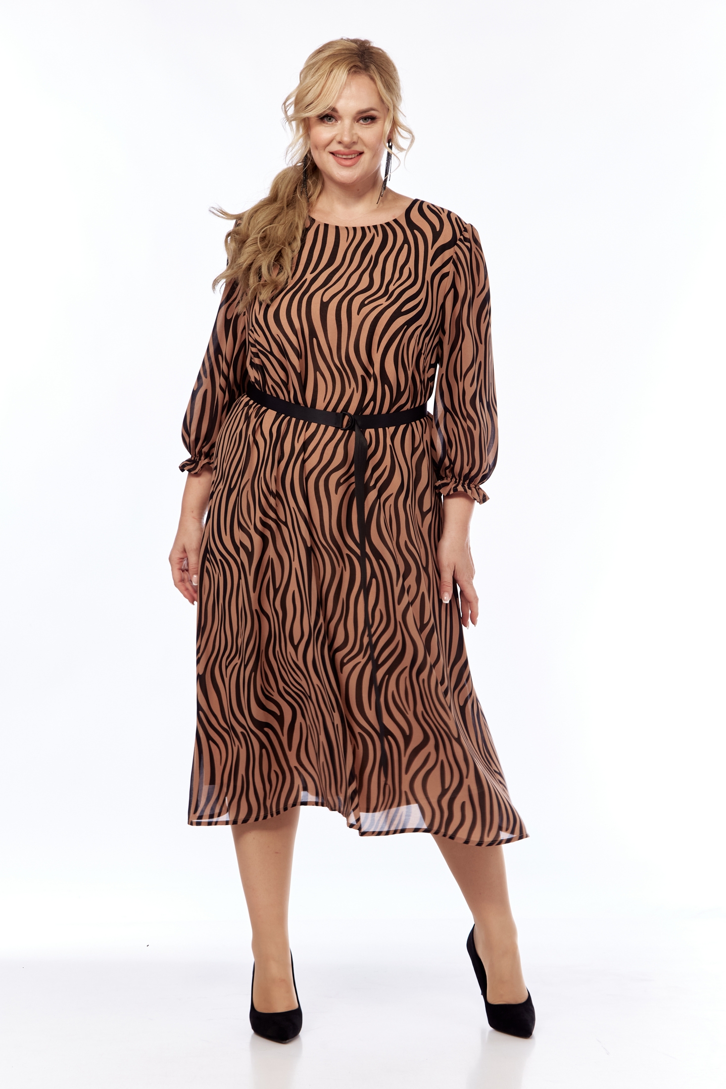 Силуэт полуприлегающий, расширенный к низу. Рукава втачные, одношовные, со сборкой по окату. Внизу рукава выполнена сборка на тонкую резинку. Длина рукава 50 см. Горловина закруглённая. Платье на подкладке. В комплекте с платьем идёт пояс. Длина платья по спинке 114 см. Платье выполнено из шифона, подкладка - из лёгкой ткани плательной группы