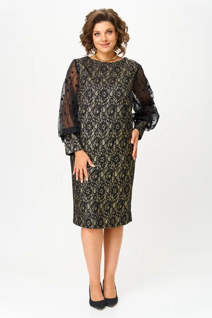 Платье женское из двух видов ткани. Основная ткань - кружевной трикотаж с люрексом. Спереди платья нагрудные вытачки. Главным украшением платья служат рукава из сетки, заканчивающийся манжетой из основной ткани. По спинке талиевые вытачки, выгодно корректирующие фигуру. Застежки нет. Шлица отсутствует. Горловина округлая.