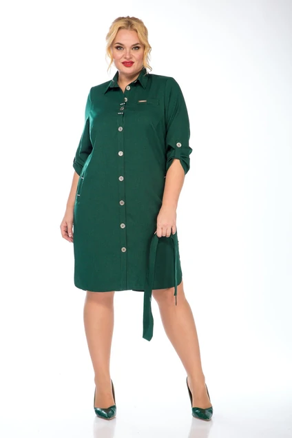 Платье женское полуприлегающего силуэта, с втачными одношовными рукавами. Для регулировки длины имеется пата. Перед цельный, с функциональными карманами «в рамку», и декоративной листочкой в области груди. Воротник рубашечного типа на притачной стойке. Застежка центральная, на притачной планке, с петлями и пуговицами. Спинка с кокеткой выше линии лопаток, и средним швом. По низу боковых швов обработаны разрезы.