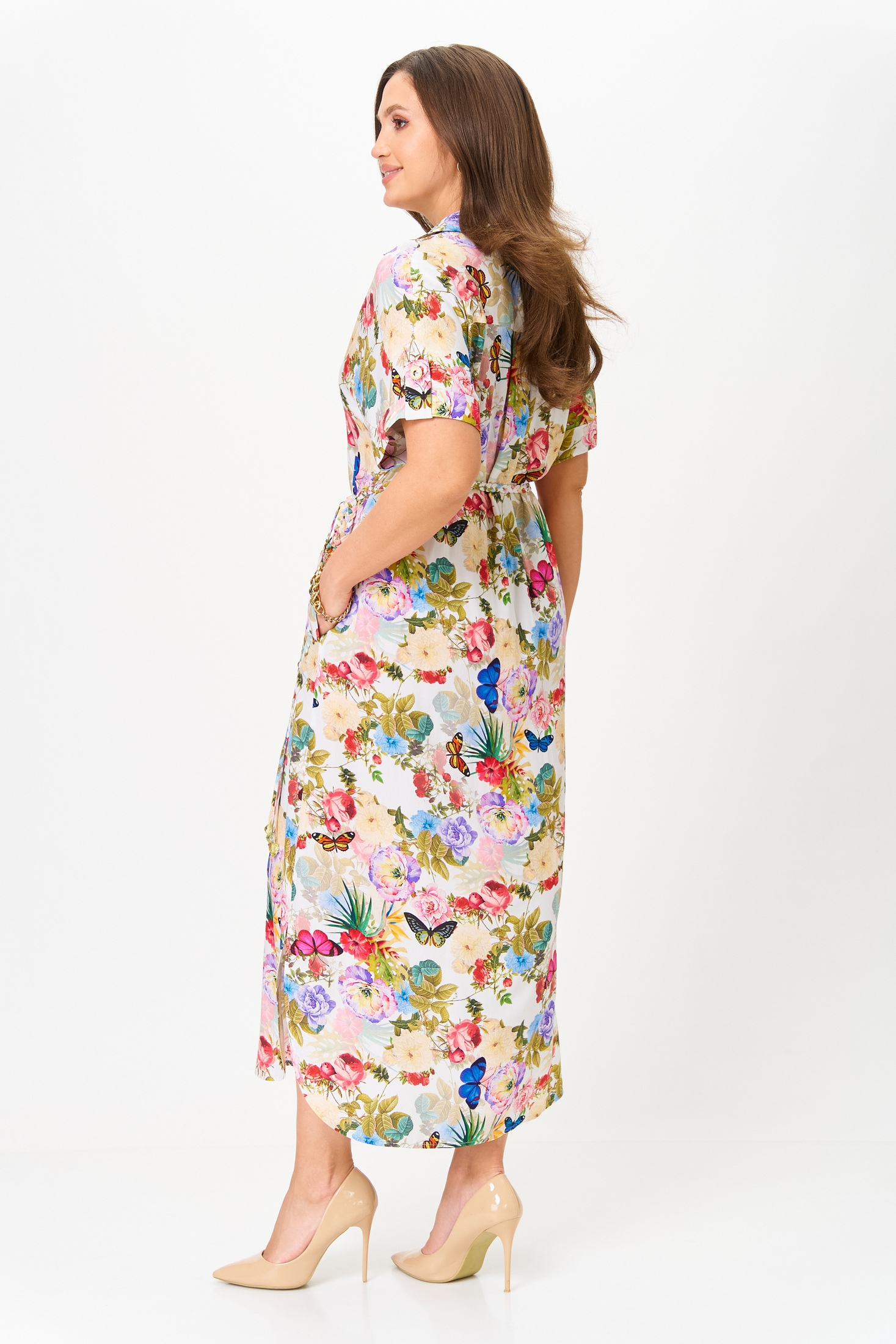 Платье женское прямого силуэта со спущенной линией плеча. Застежка центральная на петли и пуговицы. Воротник отложной на стойке. По верхней части спинки кокетка, нижняя часть спинки со встречной складкой. В боковых швах карманы. По линии талии пояс в тон ткани. Низ рукава с манжетой и декоративной патой. Платье с фигурной линией низа и разрезами.