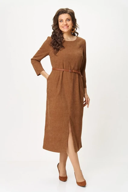 Платье женское из вельвета полуприлегающего силуэта с втачным рукавом. Перед платья с горизонтальным швом по талии. Верхняя часть с вытачками по линии груди, нижняя часть со складками в области талии и карманами что обеспечивает прекрасную посадку и подчеркивает фигуру. Разрез по переду платья добавляет нотку игривости и удобства. В комплекте съемный ремень.