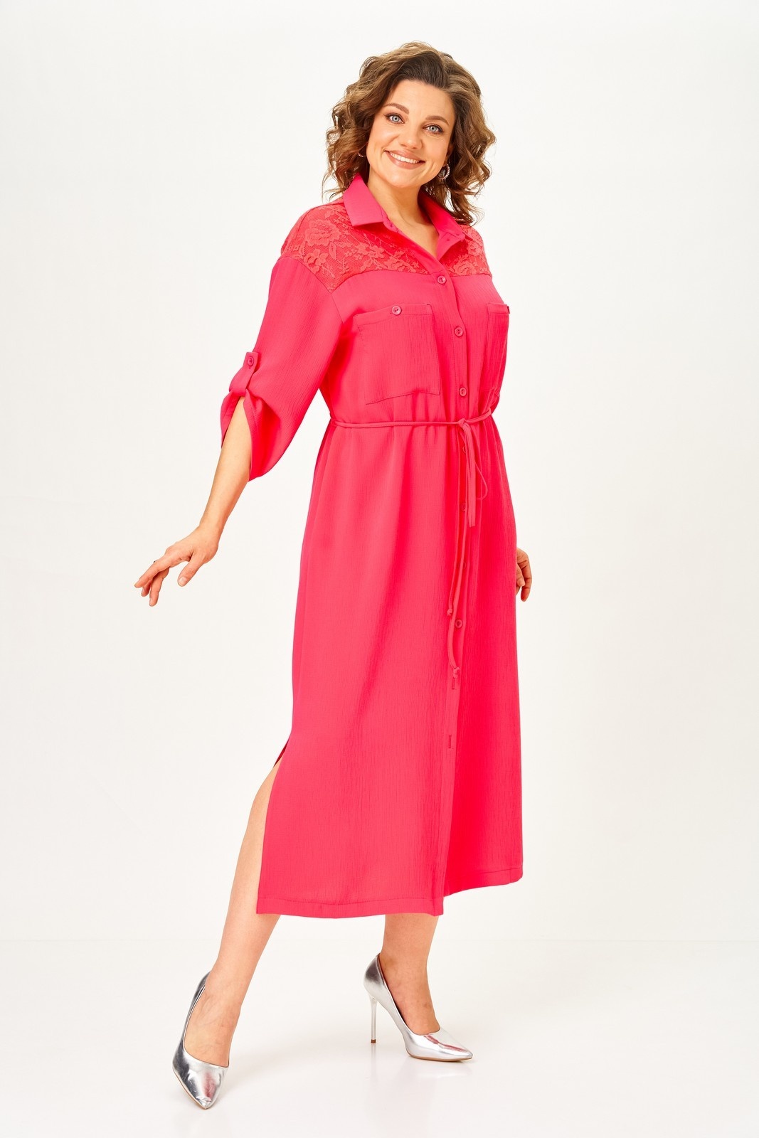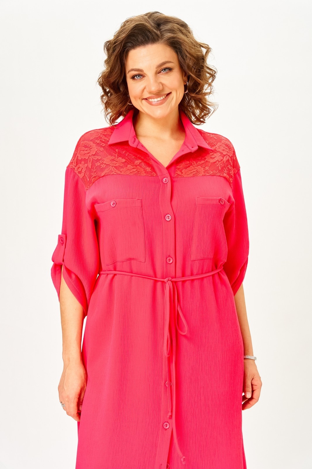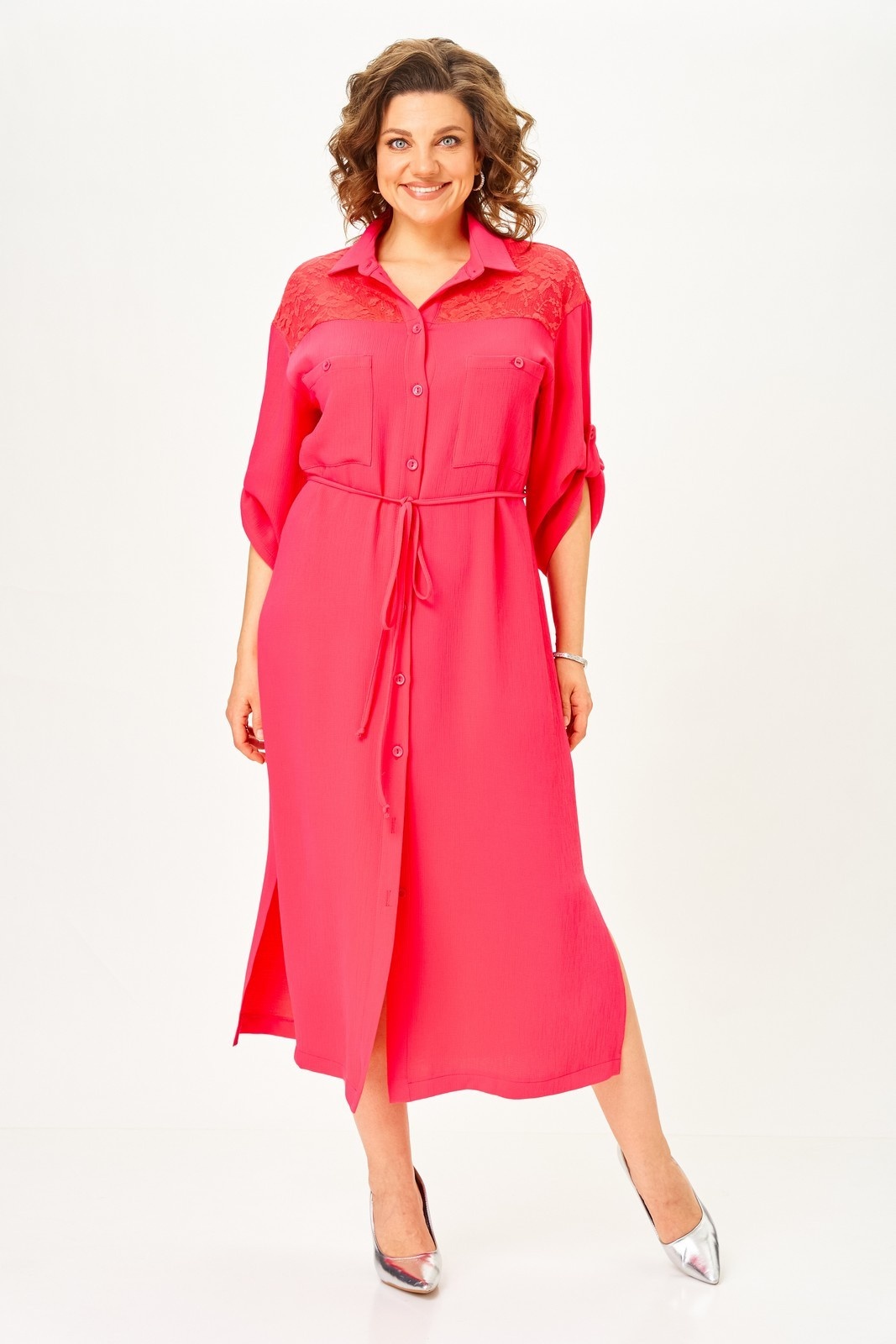 Платье 2341 коралл от Svetlana Style — это стильное решение для повседневного гардероба. Коллекция бренда отличается лёгкостью и комфортом. Материал из полиэстера, вискозы и спандекса обеспечивает удобство и эластичность. Прямой силуэт платья дополнен декоративным кружевом и накладными карманами, что придаёт изделию женственности и изысканности. Втачные рукава длиной ¾, регулируемые патой, и спущенная линия плеч создают расслабленный образ. В комплект входит съёмный пояс, подчёркивающий талию. Платье застёгивается на петли и пуговицы по центру, а боковые разрезы добавляют движения. Длина изделия по спинке составляет 127 см, а длина рукава — 58 см, что делает его подходящим для сезона весна-лето. Коралловый цвет поднимает настроение и ярко выделяет вас в любой обстановке.
