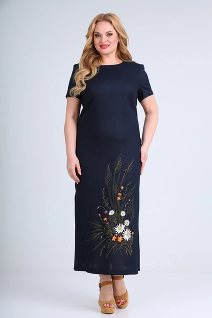 Элегантное женское платье макси до пола в темно-синем цвете, выполненное из качественного льна Вишер без добавления стрейча. Изделие дополнено ярким и стильным флористическим принтом на передней части, который добавляет изящества и уникальности. Платье с длиной рукава 21 см прекрасно сидит по фигуре, а удобная молния на спине длиной 50 см облегчает надевание. Длина платья составляет 130 см, и оно имеет практичные разрезы по бокам на высоте 48 см, которые добавляют свободы движения и визуально удлиняют силуэт.