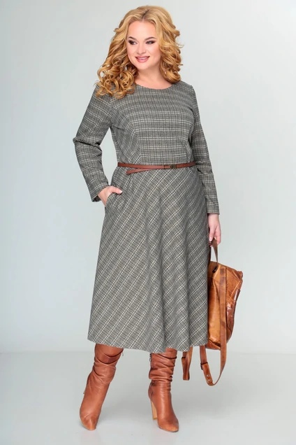 Платье женское полуприлегающего силуэта. Выполнено из трикотажного полотна. Платье отрезное по линии талии. По лифу переда расположены рельефы, по лифу спинки – талиевые вытачки. Нижняя часть платья А-силуэта. Спинка лифа платья со средним швом, в который вставлена потайная молния. Юбка платья переда и спинки цельнокроеные, выполнены по косой. В боковых швах юбки расположены карманы. Рукав втачной одношовный, длинный. В комплект входит ремень.