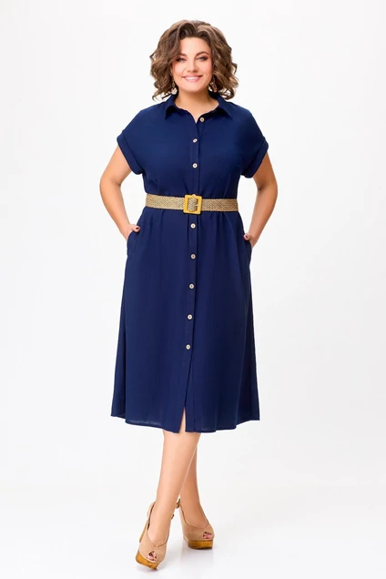Платье-рубашка из льняной ткани с вискозой свободного кроя, расклешённое к низу. Застёжка центральная на петли и декоративные пуговицы, пройма спущенная с отложной манжетой. Спинка цельная. Воротник отложной со стойкой. В боковых швах предусмотрены карманы. По желанию подчеркнуть талию можно ремнём, идущим в комплекте.